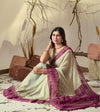 FABRIC: Soft Georgette Saree with Artistic Cream body and Deep Pink Geometric Digital Print border and pallu with Tassel Detailing (5.5 Mtr Saree)