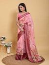 Drench yourself in the beauty of this charming saree, crafted from a soft, flowing Jacquard Patta Linen Cotton blend. It features a delicate all-over floral digital print on a subtle rose-pink base. The ensemble is completed by a rich, deeply contrasting magenta/maroon jacquard border, adding a touch of traditional opulence. Its lightweight feel and graceful drape make it perfect for intimate gatherings, festive occasions, and evening parties.