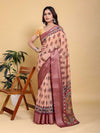 Embrace soft sophistication with this exquisite Peach/Coral Saree. It is crafted from the requested Jacquard Patta Linen Cotton fabric, offering comfort and structure. The gentle base color is adorned with a delicate multi-color digital floral print, lending a refined and graceful appearance.